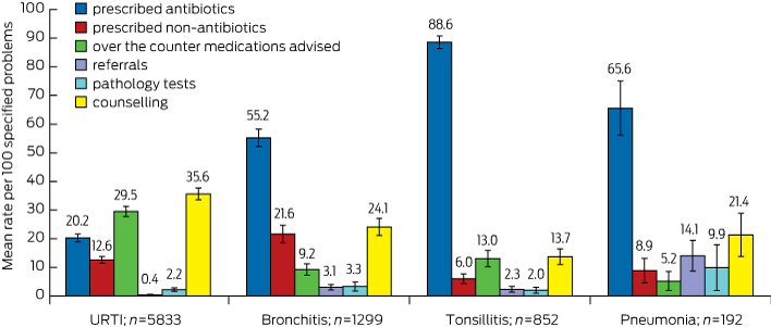 Main outcome measures: GPs' management of four common RTIs (acute upper RTI [URTI], acute bronchitis/bronchiolitis, acute tonsillitis, and pneumonia) in association with six management options: antibiotic medications; prescribed or supplied non-antibiotic medications; medications advised for over-the-counter purchase; referrals; pathology testing; and counselling.