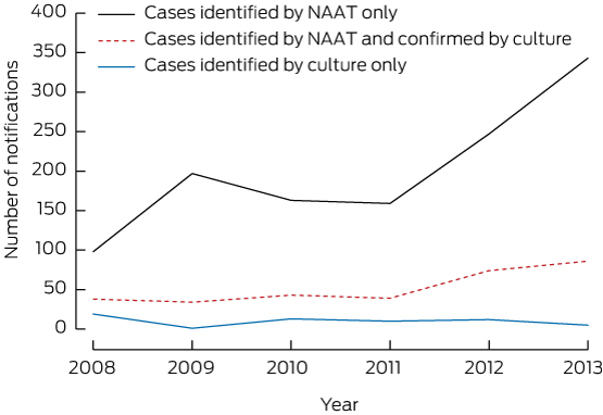 In conclusion, testing for gonorrhoea using NAAT is currently being done in a very low-prevalence population in Victoria, contrary to the manufacturers' and other guidelines, and likely resulting in a substantial number of false-positive results and unnecessary treatment. The current increase in notifications may be an artefact of more testing for gonorrhoea using automated multiplex NAAT. In Victoria, and Australia outside of high-prevalence populations (eg, Indigenous populations and MSM),12,29 testing should be minimised or done by culture unless the pretest probability is high (eg, symptoms of pelvic inflammatory disease, had a gonorrhoea contact, engaged in commercial sex, or had sex overseas). Positive gonococcal NAATs among low-risk women should then be confirmed by culture or regarded as doubtful. This will minimise the number of false-positive notifications, and reduce potential harm to individuals.