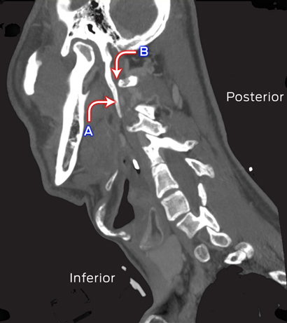 Sagittal computed tomography image of the neck of the patient. A: Elongated styloid process (left); B: Area of compression of IX, X and XII cranial nerves.