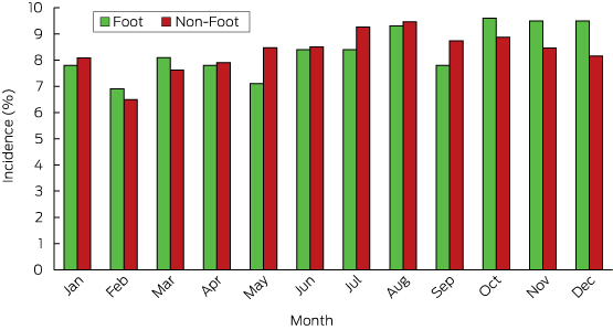 There was a strong positive correlation between the month of the year and the number of self-inflicted GSWs to the foot; a disproportionate number of incidents occurred in October, November and December. It is notable that these trends were much stronger than for other firearm-related incidents, with a relatively constant number of these incidents throughout the year.