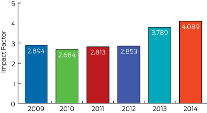 Whether any of us like it or not, our performance in medicine is being increasingly measured and critiqued, and it’s no different for medical journals. Clinicians and academics want to publish in the best medical journals and one metric applied universally is the impact factor, calculated by counting the mean number of citations received per article published during the previous 2 years. In the best journals, editors arguably “live and die” by the journal impact factor published each year. The impact factor is flawed (some argue fatally so) and is not used by the National Health and Medical Research Council; but it can’t be ignored either!1,2 In 2015, the MJA, your national journal, ranks in the top 20 general medical journals worldwide and has a highly respectable impact factor of 4.089 (Box, previous page). I am pleased to say that the impact factor of the MJA has risen and I anticipate over the coming years that it will continue to rise (as will other metrics of excellence) as we further increase the quality and reach of what we publish.
