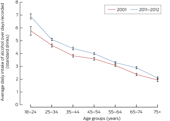 mean alcohol consumption for each age group had increased between 2001 and 2011–2012;