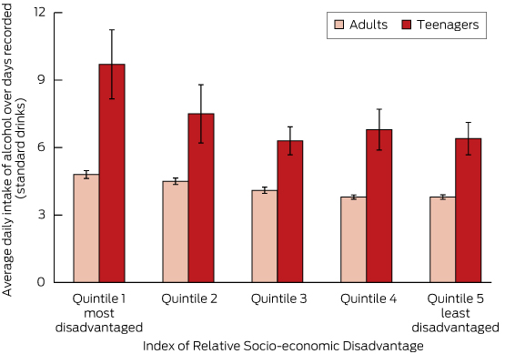 Box 2 presents the weighted average daily alcohol intake over days recorded by IRSD quintiles. Quintile 1 includes areas with the highest levels of socioeconomic disadvantage (ie, the most disadvantaged 20%) and quintile 5 the least disadvantaged. The difference in alcohol consumption between the highest and lowest quintiles was in the order of 21% for adults (aged 18 years or older) and 34% for teenagers (15–19 years). Mean alcohol consumption among teenagers was substantially higher than for adults in every quintile.