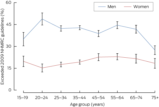 The 2009 NHMRC guidelines for reducing lifetime risk from drinking alcohol6 were used to analyse the 2011–2012 survey. Unlike the 2001 NHMRC guidelines, the 2009 guidelines do not provide separate recommendations for men and women. In order to reduce the lifetime risk of disease or injury, they recommend “drinking no more than two standard drinks on any day” and “no more than four standard drinks on a single occasion”.