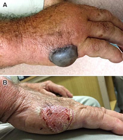 A: Haemorrhagic bullous lesion on the patient’s right hand at presentation caused by Photobacterium damselae infection. B: Lesion resolution 2 weeks after treatment.