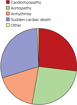 The distribution of diagnostic categories at referral is presented in Box 2. Inherited cardiac disease in our clinic is categorised into four broad groups: cardiomyopathies, aortopathies, arrhythmias and survivors of cardiac arrest together with families of an SCD individual. In this study:
