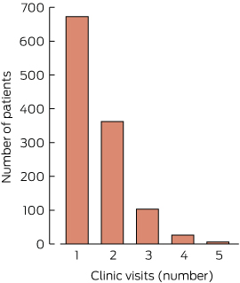 The number of visits per individual during the study period ranged from one to five. Most patients (57.5%) were seen only once. A very small number of individuals (six) were seen on five occasions (Box 3).