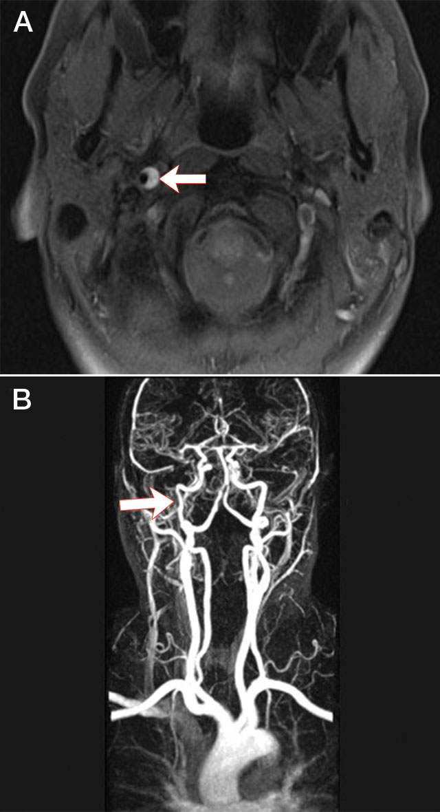 A 42-year-old woman with no vascular risk factors was admitted with neck pain and right Horner syndrome after riding a roller coaster. Magnetic resonance imaging (MRI) of her neck showed a characteristic crescent-shaped intramural haematoma in the right internal carotid artery1 (Figure, A), confirmed by magnetic resonance angiogram (MRA) (Figure, B). T1-fat-suppressed MRI and arterial wall imaging are currently the most sensitive techniques for diagnosis of dissection. Riding roller coasters has been associated with shearing neck injury leading to cervical artery dissection.2 Our patient was treated with warfarin for 6 months, leading to the intramural haematoma resolving and the Horner syndrome greatly improving.