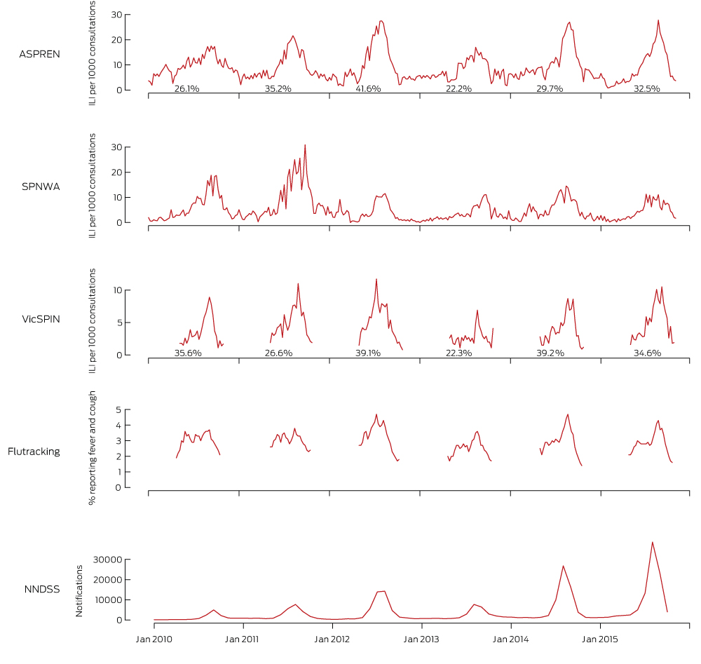 As shown in the Box, peak ILI rates in ASPREN, VicSPIN and Flutracking data during 2015 were not notably higher than during the preceding 5 years, and were similar to those of 2012. However, the percentage of positive PCR test results was lower in 2015 than in 2012. The peak ILI rate for SPNWA in 2015 was similar to the low peak of 2013. In contrast, cases of laboratory-confirmed influenza notified to the National Notifiable Diseases Surveillance System (NNDSS) increased by an average of 67% annually between 2010 and 2014, with a record 93 303 cases notified to 31 October 2015.