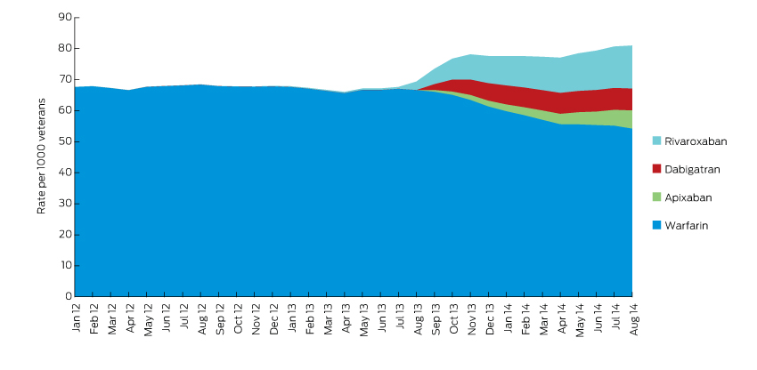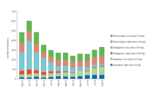 Clinical trials have shown that novel oral anticoagulants (NOACs) are as efficacious as warfarin in reducing the risk of stroke in patients with atrial fibrillation.1-3 However, concerns regarding efficacy and safety in real-world populations remain, particularly in patients aged 75 years and older and those with comorbid conditions.4 Three NOACs — dabigatran, rivaroxaban and apixaban — were listed by the Pharmaceutical Benefits Scheme in 2013, but there is little information about their uptake in clinical practice in Australia.