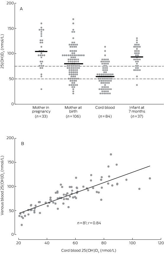 Design and participants: Within a nested cohort of 109 Indigenous mother–infant pairs recruited between 2006 and 2011, we used liquid chromatography–mass spectrometry to measure vitamin D (25(OH)D3) levels in maternal blood during pregnancy (n = 33; median gestation, 32 weeks [range, 28–36 weeks]) and at birth (n = 106; median gestation, 39 weeks [range, 34–41 weeks]), in cord blood (n = 84; median gestation, 39 weeks [range, 36–41 weeks]), and in infant blood at age 7 months (n = 37; median age, 7.1 months [range, 6.6–8.1 months]).