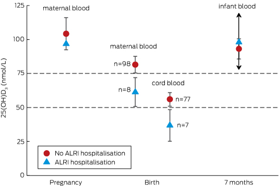 Results: Compared with mean 25(OH)D3 levels in maternal blood during pregnancy (104 nmol/L), mean levels were 23% lower in maternal blood at birth (80 nmol/L) and 48% lower in cord blood samples (54 nmol/L). The mean cord blood 25(OH)D3 concentration in seven infants subsequently hospitalised for an ALRI was 37 nmol/L (95% CI, 25–48 nmol/L), lower than the 56 nmol/L (95% CI, 51–61 nmol/L) in the 77 infants who were not hospitalised with an ALRI (P = 0.025).