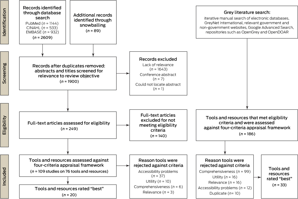 Through the grey literature search, we identified 186 tools or resources that met the eligibility criteria (Appendix 5). Of these, 12 were rejected because of accessibility problems. A further ten tools or resources were duplicates and also excluded. Of the remaining 164 tools and resources, 131 scored less than 7 on the four-criteria appraisal and were rejected due to problems related to comprehensiveness (n = 99), utility (n = 16) and relevance (n = 16). This left 33 tools or resources identified as the best from the grey literature (Appendix 4).