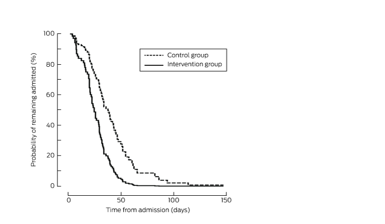 Results: After controlling for sex, anaesthetic type and home setting, the between-group difference in Day 5 mILOA score favoured the intervention group (mean difference v control group, –2.7 points; P = 0.04). Hospital LOS was also shorter for the intervention group (median, 24.4 days v 35.0 days; P = 0.01). A Cox proportional hazard model that controlled for potential confounders indicated that the probability of discharge was greater for intervention group patients at all time points following surgery (P < 0.001). Re-admission and complication rates and 6-month outcomes for the two groups were not significantly different.