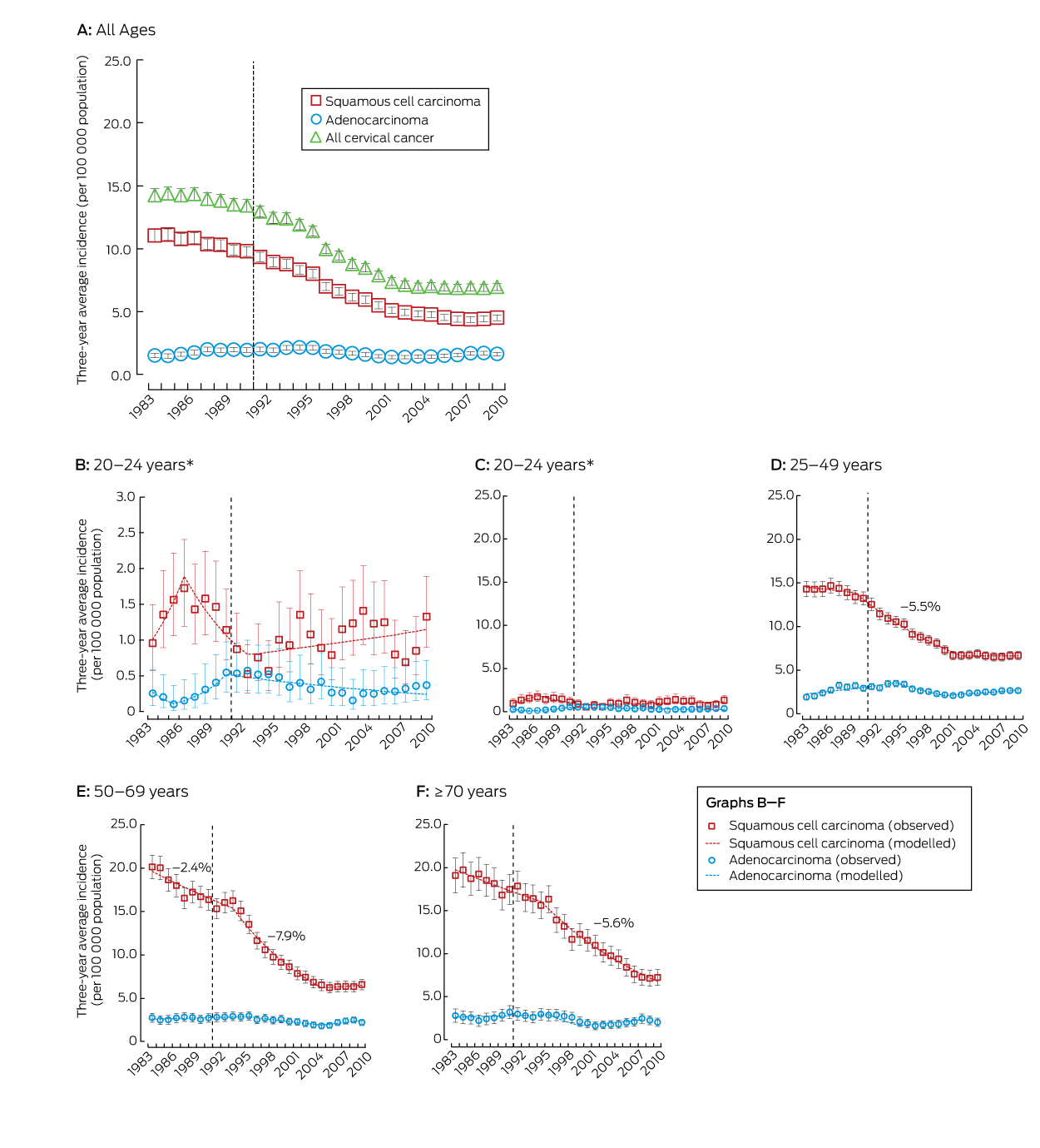 National cervical cancer incidence data for the period 1982–2010 were obtained from the Australian Institute of Health and Welfare. Age-specific rates were calculated, using population estimates from the Australian Bureau of Statistics.13 Three-year average rates were calculated for cervical cancer overall and separately for histological subtypes. The main analyses focused on squamous cell carcinoma (SCC) and adenocarcinoma, but trends for rarer subtypes (adenosquamous and other cancers) were also explored.