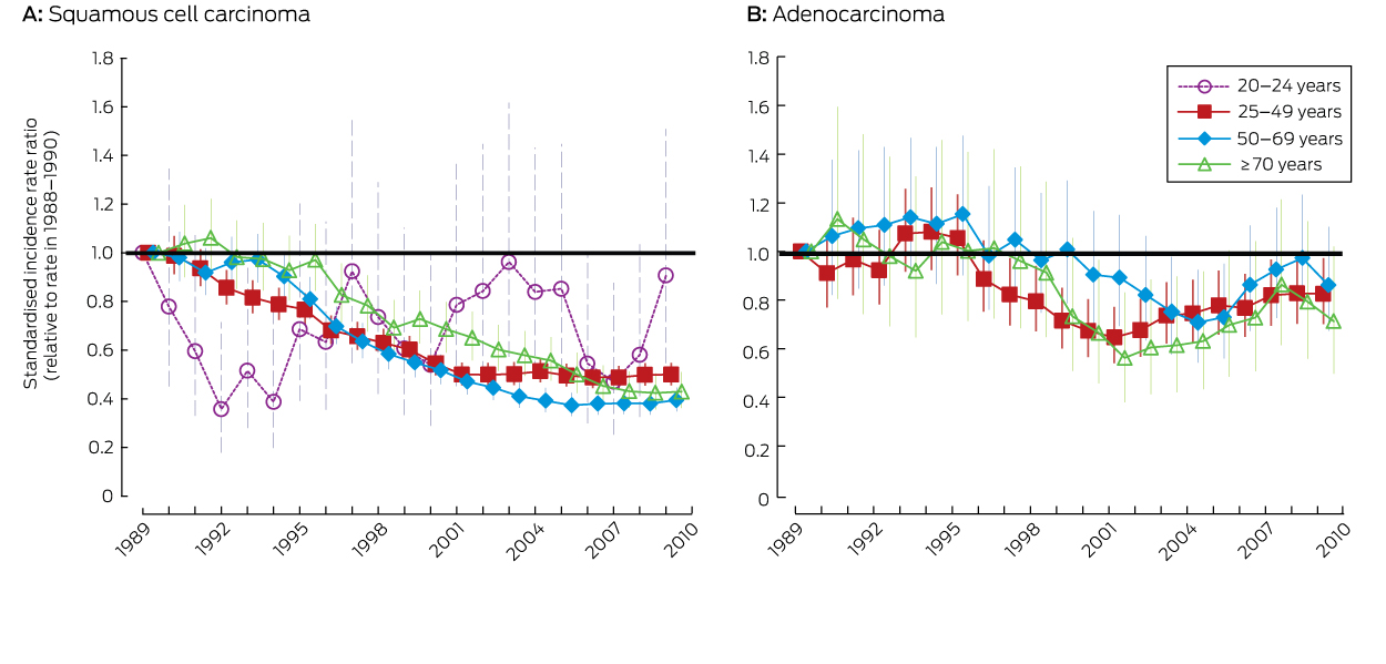 Results: Between 1988–1990 and 2008–2010, cervical cancer incidence fell substantially in women aged 25–49 (SRR, 0.55; 95% CI, 0.51–0.59), 50–69 (SRR, 0.46; 95% CI, 0.42–0.51) and 70 years or more (SRR, 0.50; 95% CI, 0.43–0.58), but not in women aged 20–24 years (SRR, 0.70; 95% CI, 0.46–1.05). These declines were primarily driven by drops in squamous cell carcinoma (SCC) in women aged 25–49 (SRR, 0.50; 95% CI, 0.46–0.55), 50–69 (SRR, 0.39; 95% CI, 0.35–0.45) and more than 70 years (SRR, 0.43; 95% CI, 0.36–0.51). However, rates have now plateaued in women aged 25–69 years. The incidence of adenocarcinoma did not consistently decline across the program period in any age group. The incidence of neither SCC (SRR, 0.91; 95% CI, 0.55–1.51) nor adenocarcinoma (SRR, 0.91; 95% CI, 0.35–2.40) declined in women aged 20–24 years.