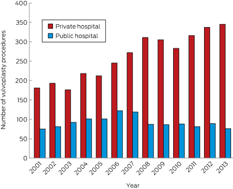 The annual number of vulvoplasties performed in NSW hospitals on women aged 15–54 years increased by 64.5% between 2001 and 2013. However, the majority of Australian providers who advertise vulvoplasty surgery services indicate that these procedures are performed on an outpatient basis under local anaesthetic.1 During the same period, Medicare rebate data for NSW (which also captured clinically indicated, out-of-hospital procedures) indicated a 142% increase in the number of procedures, suggesting marked increases in the numbers of vulvoplasty procedures both in and out of hospital.21 Following changes to the MBS in 2014, restrictions of the eligibility for Medicare rebates for these procedures were tightened. The number of vulvoplasties recorded by Medicare subsequently declined, with 240 rebates paid in NSW in 2015, compared with 448 in 2013.4 Data have never been available for cosmetic out-of-hospital procedures (ie, those that are not clinically indicated), so that the total number of vulvoplasty procedures performed cannot be determined.