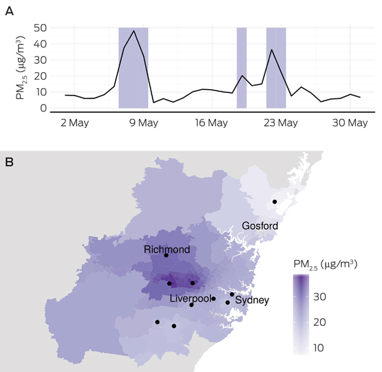 Hazard reduction burning reduces the risks associated with bushfires,1 but produces fine particulate matter air pollution (particles of less than 2.5 μm diameter, PM2.5), which has recognised effects on health.2 In May 2016, hazard reduction burns around Sydney caused smoky conditions with high PM2.5 concentrations on several days. We describe a rapid assessment of the impact of smoke-related PM2.5 on all-cause mortality, and on hospitalisations for cardiovascular and respiratory conditions in the Sydney Greater Capital City Statistical Area (GCCSA) during May 2016.