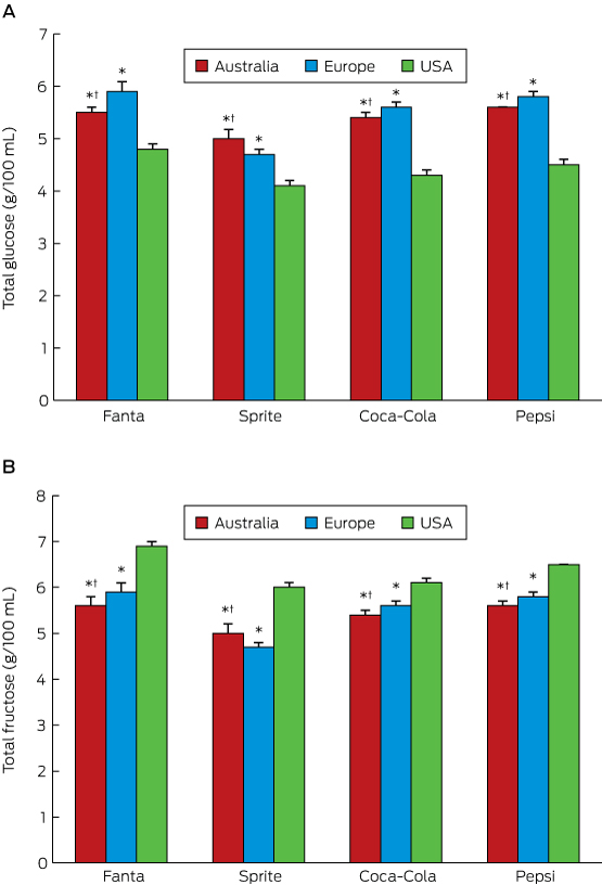 The mean total glucose concentration of Australian soft drinks was 0.96 g/100 mL (SD, 0.22) higher than for the corresponding US drinks, a mean 22% (SD, 6%) difference (P < 0.05; Box). Most glucose in Australian formulations was attributable to sucrose (online Appendix). The total glucose concentration of European soft drinks was generally similar to that of Australian formulations (1.04 g/100 mL [SD, 0.34] higher than US formulations, or 23% [SD, 8%] greater; P < 0.05; Box). The total fructose concentration was lower in Australian (mean difference, 0.97 g/100 mL; SD, 0.28) and European formulations (0.89 g/100 mL; SD, 0.35) than in corresponding US formulations (P < 0.05; Box). The concentration of total sugars was, consequently, similar for corresponding drinks from the three regions.