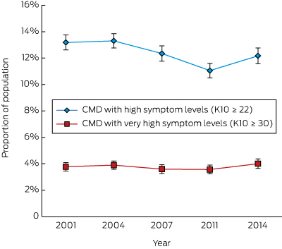 Results: There was no change in the prevalence rate of probable CMDs with very high symptom levels between 2001 and 2014, but a slight decrease in the prevalence of probable CMDs with high symptoms levels, particularly among those under 45 years of age. Over the same period, the proportion of working age individuals receiving DSPs for psychiatric conditions increased by 51% (for trend, P < 0.001), equivalent to one additional DSP for every 182 working age Australians.