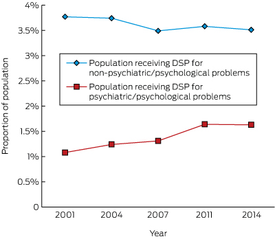 We retrieved national data on the numbers of people receiving DSPs for psychological or psychiatric primary medical conditions17 between 2001 and 2014 from the website of the Department of Families, Housing, Community Services and Indigenous Affairs (now: Department of Social Services), and compared changes in their rates with trends in CMD prevalence. The proportion of the Australian working age population receiving a DSP for a mental illness was calculated by dividing the number of DSP recipients by the working age population (aged 16–64 years) for each year (ABS data).