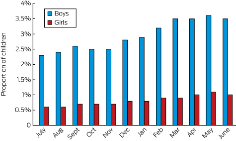 Four international studies have found that the youngest children in a school class are more likely than their classmates to receive pharmacological treatment for attention deficit/hyperactivity disorder (ADHD).1-4 We investigated whether this late birth date effect applies to children in Western Australia. We compared the proportions of WA children born in the early and late months of a recommended school-year intake who received at least one Pharmaceutical Benefits Scheme prescription for an ADHD medication in 2013 (Box).