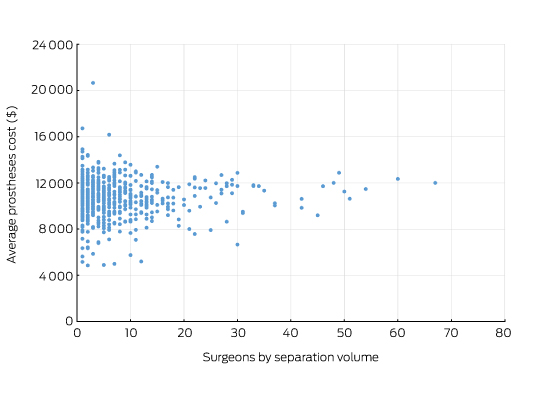The cost of a surgical episode of care includes the sum of hospital, surgeon and other providers’ fees, the prosthesis, and pharmaceuticals. The use of ICU after the operation or transfer to rehabilitation following a surgical admission varied considerably. For the 299 surgeons who performed at least five procedures, the average separation cost of a surgeon ranged between $18 309 and $61 699 with a median of $26 661 (the average total cost per hospital separation was $27 310). High volume surgeons showed greater congruity and were closer to the median in terms of the overall cost of a hip replacement. There was little variation in regional (state and territory) total costs.9