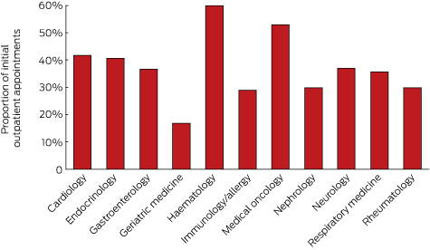 Design, participants and setting: Analysis of 2015 Medicare claims data for an initial outpatient appointment with a consultant physician (Item 110) in 11 medical specialties representative of common adult non-surgical medical care (cardiology, endocrinology, gastroenterology, geriatric medicine, haematology, immunology/allergy, medical oncology, nephrology, neurology, respiratory medicine and rheumatology).
