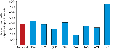 We analysed aggregated, non-identifiable Medicare data from the Commonwealth Department of Human Services (DHS) on Medicare claims for item number 110 (an initial appointment with a consultant physician following a referral2) rendered between 1 January 2015 and 31 December 2015. The data file was reviewed by the Department of Health before it was released to us. To prevent specific providers being identified, the DHS suppressed data when fewer than 20 services were provided in a specific specialty in a state or territory.