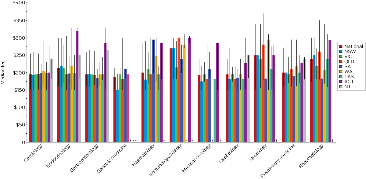 Publicly available data indicate that the average out-of-pocket charge for private outpatient medical specialist or consultant physician appointments is $71.90.5 However, fee differences between medical specialties and between states/territories have not been examined.