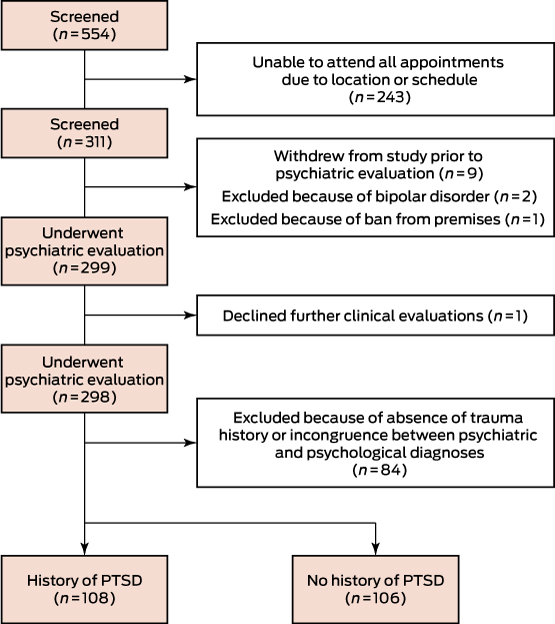 A total of 311 participants were enrolled, of whom 298 underwent all assessments (Box 1). Of these, 108 were confirmed by both psychiatric interview and CAPS-5 evaluation as having or having had PTSD, while 106 trauma-exposed controls had not, according to both measures. Participants who did not meet DSM-5 criteria for trauma exposure were excluded, as were those for whom the psychiatrist and CAPS-5 diagnoses were discordant.