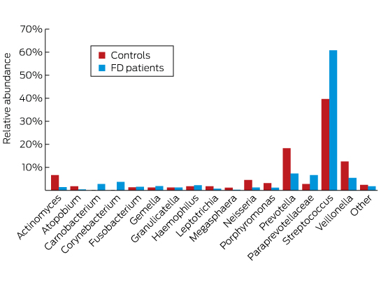In a study of the duodenal mucosal microbiome, patients with functional dyspepsia were found to have a greater relative abundance of Streptococcus and decreases in the relative abundance of other genera such as Prevotella, Veillonella and Actinomyces compared with control subjects, suggesting that their symptoms may be related to alterations of their microbiome at this site (Box).8