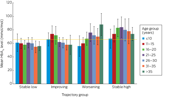 For the stable low group (143 participants, 28%), the mean paediatric, adult and overall HbA1c levels were 57 mmol/mol (SD, 6.6), 57 mmol/mol (SD, 6.6), and 58 mmol/mol (SD, 3.3) respectively (Box 1). Only one person in this group had a documented complication (a 29-year-old man who had had an amputation).