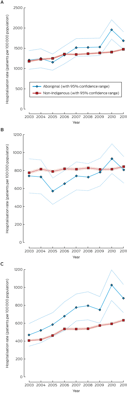 Two data sources were linked for this study: the NSW Admitted Patient Data Collection (APDC), and death records from the NSW Register of Births, Deaths and Marriages. The APDC is a census of all admitted patient services provided by all 428 NSW hospitals, of which 55% are public.6 Details of each hospitalisation are coded according to the Australian modification of the International Statistical Classification of Diseases and Related Problems, 10th revision (ICD-10-AM).7 Probabilistic linkage of the data extracts was performed by the NSW Centre for Health Record Linkage (CHeReL, http://www.cherel.org.au). As 95.4% of the NSW Indigenous population is Aboriginal,8 this population is referred to as “Aboriginal” in this article.