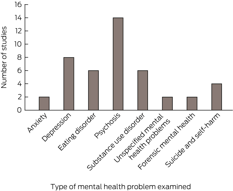 The types of mental health problems addressed by the included studies are shown in Box 2. About a third (n = 14) of the included studies focused on psychotic disorders. The next most common problem addressed was depression (n = 8), followed by substance use disorders (n = 6), eating disorders (n = 6), suicide and self-harm (n = 4), anxiety (n = 2), forensic mental health (n = 2) and general mental illness (n = 2). No studies specifically focused on services for young people with personality disorders.