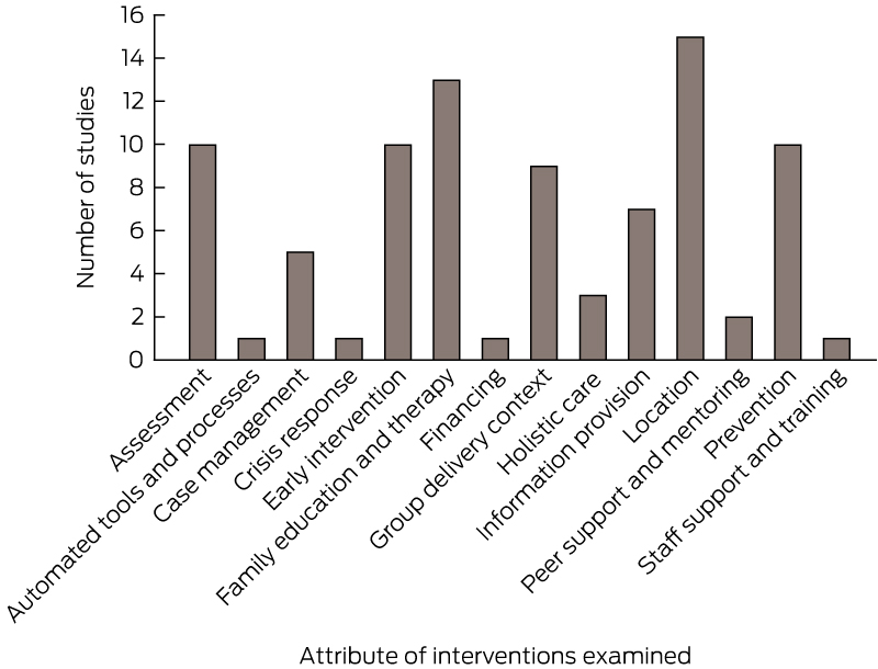 For each included study, we identified the attributes that comprised the interventions being examined and analysed these thematically to identify potentially cost-effective attributes of youth mental health care. As first-episode psychosis services can have up to 16 service components,35 and it was not always clear how many of these attributes were present in each case, we assigned these services a catch-all attribute of “early intervention”.