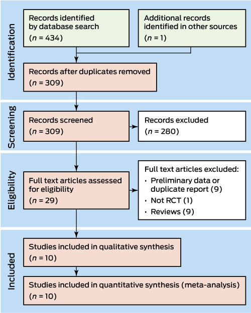 Faecal microbiota transplantation (FMT) has emerged as an important approach to treating CDAD resistant to antibiotic therapy. Treating patients with abdominal disorders with faecal preparations was first described more than 1000 years ago,9 but only recently has its potential value for treating CDAD been realised.10 Recent guidelines from Europe11,12 and North America13 recommend FMT for treating antibiotic-resistant CDAD; Australian and New Zealand guidelines on therapy for CDAD need to be updated.14 However, the overseas guidelines are based on systematic reviews of data largely derived from case series,13,15 so that the quality of evidence is not optimal. Several randomised controlled trials (RCTs) of FMT for CDAD have since been published, motivating us to undertake a systematic review of these RCTs that could inform future guidelines on the topic.
