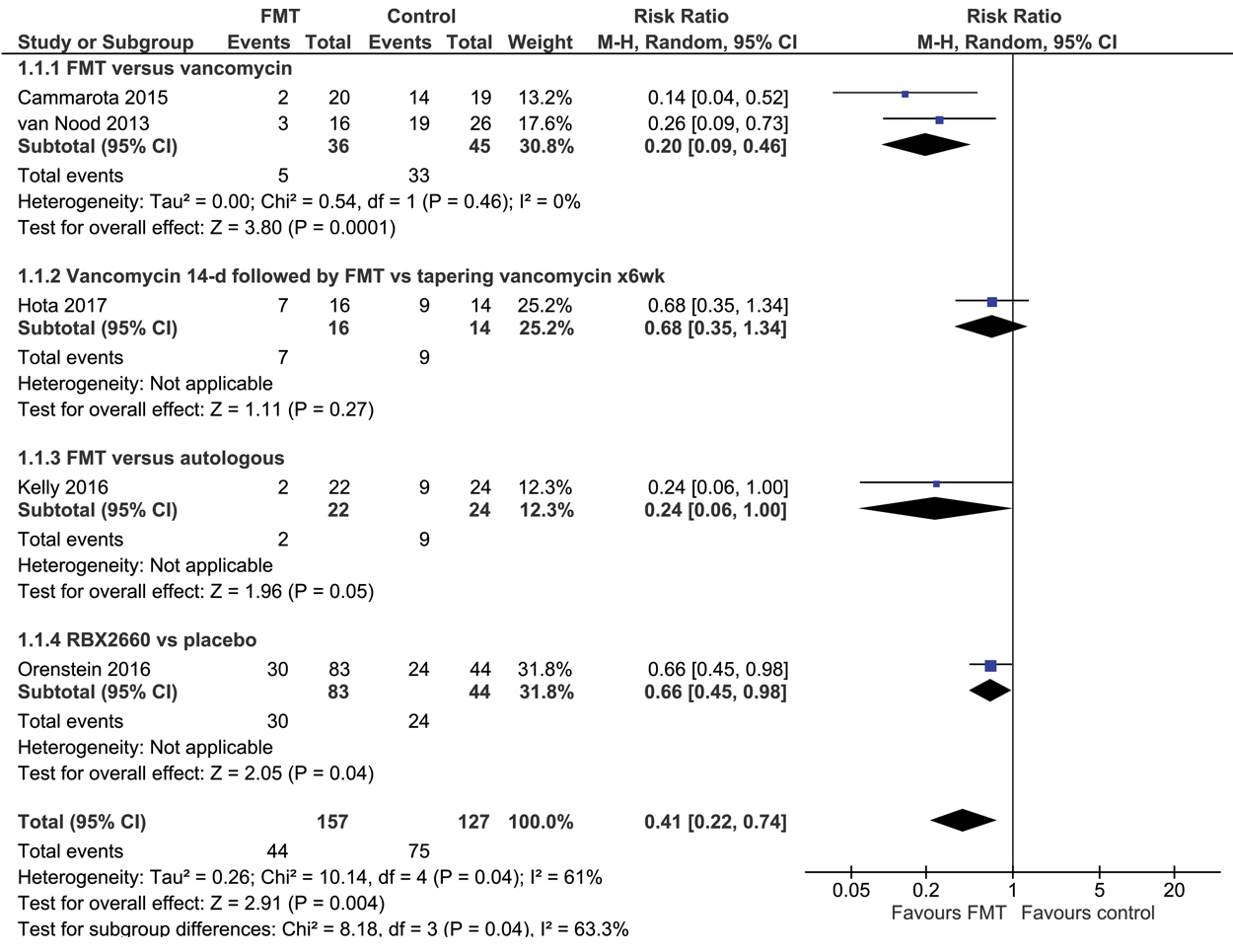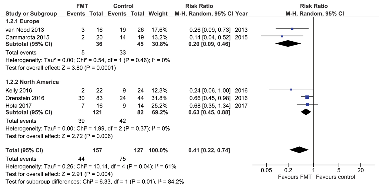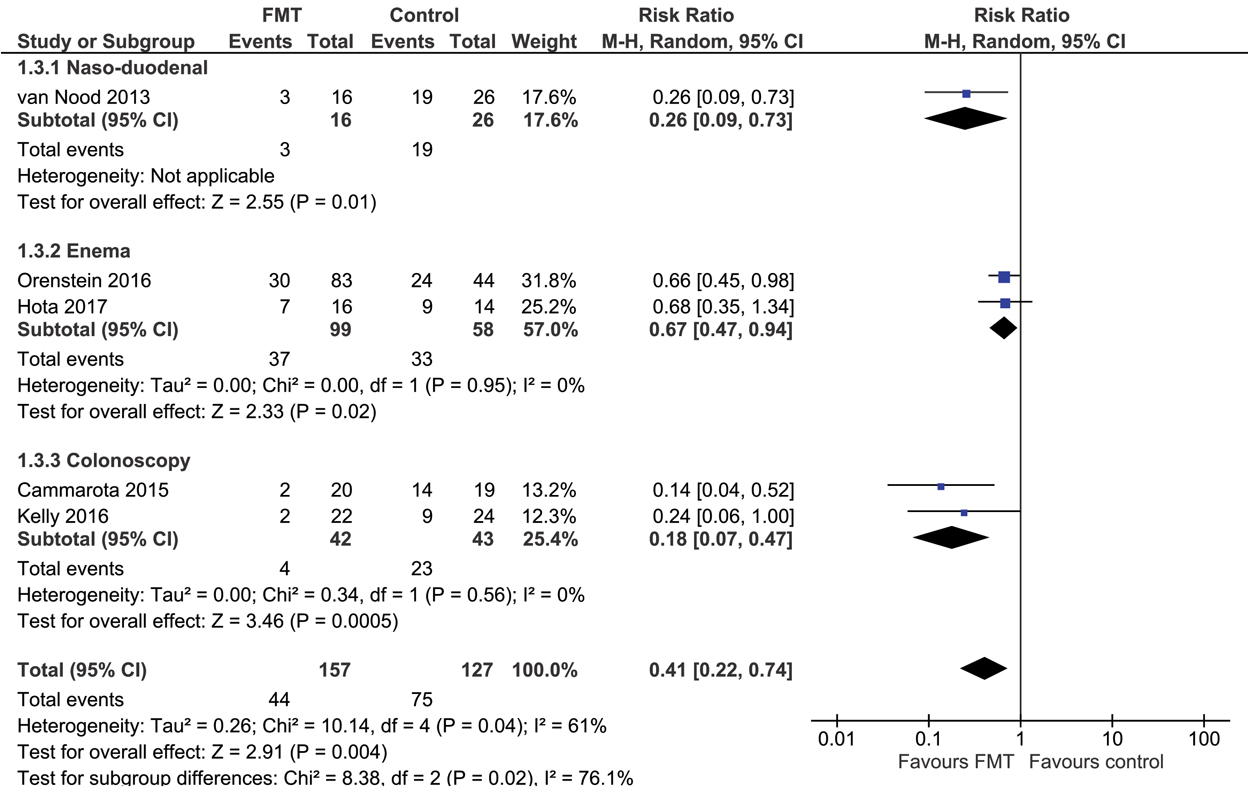 Data synthesis: We identified ten RCTs that evaluated the treatment of a total of 657 patients with CDAD. Five RCTs compared FMT with placebo (including autologous FMT) or vancomycin treatment (total of 284 patients); FMT was statistically significantly more effective (RR, 0.41; 95% CI, 0.22–0.74; NNT, 3; 95% CI, 2–7). Heterogeneity across studies was significant (I2 = 61%); this heterogeneity was attributable to the mode of delivery of FMT, and to the therapy being more successful in European than in North American trials. The other five RCTs evaluated different approaches to FMT therapy. Frozen FMT preparations were as efficacious as fresh material in one RCT, but the numbers of patients in the remaining RCTs were too small to allow definitive conclusions.