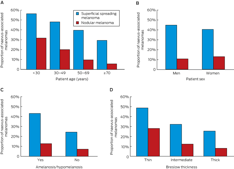 Results: Of 3678 primary melanomas, 1360 (37.0%) were histologically associated with a naevus and 2318 (63.0%) were de novo melanomas; 71 of 621 nodular (11.4%) and 1289 of 3057 superficial spreading melanomas (42.2%) were histologically associated with a naevus. In multivariable analyses, the odds of being associated with a naevus were higher for melanomas located on the trunk (v head and neck: adjusted odds ratio [OR], 2.27; 95% CI, 1.73–2.96; P < 0.001), while the odds were lower for thicker tumours (adjusted OR, 0.75 per millimetre increase in Breslow thickness; 95% CI, 0.69–0.81; P < 0.001), amelanotic/hypomelanotic melanomas (adjusted OR, 0.68; 95% CI, 0.48–0.97; P = 0.035), and older age (patients 70 years or older v patients under 30 at diagnosis: adjusted OR, 0.28; 95% CI, 0.20–0.40; P < 0.001). After adjusting for confounders, the odds of an associated naevus was three times as high for superficial spreading melanomas as for nodular melanomas (adjusted OR, 3.05; 95% CI, 2.24–4.17; P < 0.001).