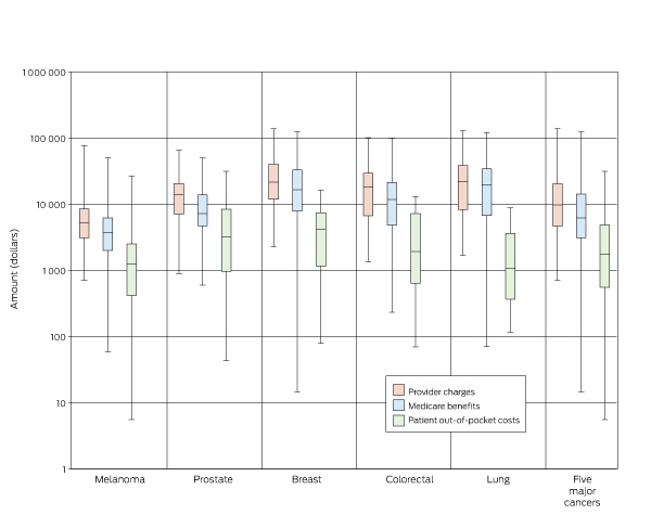 A total of 452 QSkin participants had a primary diagnosis of one of the five major cancers during the 12-month window: 200 with melanoma (44%), 114 with prostate cancer (25%), 84 with breast cancer (19%), 30 with colorectal cancer (7%) and 24 with lung cancer (5%). Over 2 years, total provider fees were highest for those with lung (median, $22 011; interquartile range [IQR], $8346–38 387) or breast cancer (median, $21 581; IQR, $11 982–40 350), and lowest for those with melanoma (median, $5248; IQR, $3132–8513). However, median out-of-pocket expenses were highest for patients with breast ($4192; IQR, $1165–7459) and prostate cancer ($3175; IQR, $971–8431) and lowest for participants with lung cancer ($1078; IQR, $367–3619) (Box). The median proportion of provider fees covered by Medicare subsidies was 63% (range, 51% [prostate cancer] to 89% [lung cancer]). The largest median out-of-pocket costs (five cancers) were for therapeutic procedures ($670; IQR, $0–2591), professional attendances ($414; IQR, $140–786) and medications ($288; IQR, $52–620). The median provider fee (five cancers) was $9821 (IQR, $4645–20 551); the median Medicare subsidy was $6280 (IQR $3342–14 768).