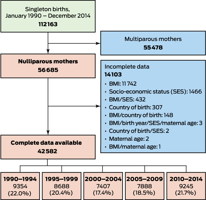 A total of 112 163 singleton births were recorded during 1980–2014, and we calculated the early pregnancy BMI for 42 582 nulliparous women with singleton births (Box 1). The characteristics of women excluded because of missing data (mostly height or weight data; online Appendix, tables 1 and 2) were similar to those of the included women (Box 2) in terms of age, country of birth, and smoking status. Women with missing data were more likely to have a higher socio-economic status postcode than those with complete data.
