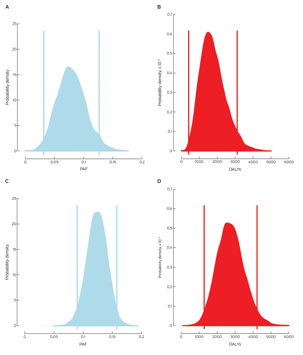where p = proportion of children exposed to the risk factor; RR = relative risk (or odds ratio) of asthma for children exposed to the risk factor.16 The PAF estimate was multiplied by a randomly selected value from the asthma burden distribution to calculate the estimated disease burden in DALYs:10