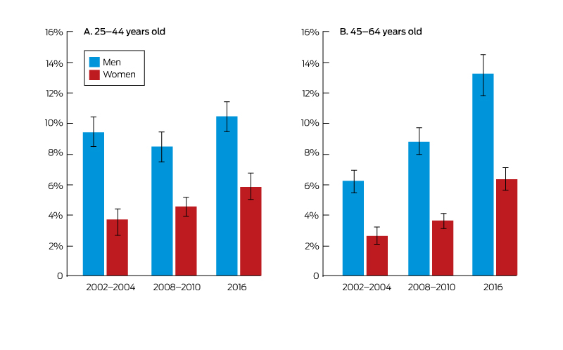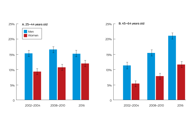 Middle-aged men were defined as those aged 45–64 years, although earlier definitions of Mamil included younger men (“young Mamils”, 25–44 years old). Socio-economic status of residential address was according to the Australian Bureau of Statistics 2016 Index of Relative Socio-economic Disadvantage (IRSD);7 national percentiles were grouped into quartiles (quartile 1, most disadvantaged). Proportions (with 95% confidence intervals [CIs]) were estimated with the SAS 9.4 (SAS Institute) survey analysis procedures, accounting for the complex designs of each survey.