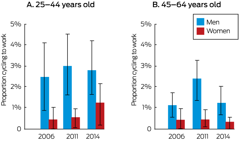 According to New South Wales Population Health Survey data, the proportions of 45–64-year-old men cycling for commuting purposes were similar in 2006, the earliest survey (1.1%; 95% CI, 0.5–1.7%; 13 riders), and 2014 (1.3%, 95% CI, 0.6–2.0%; 19 riders). The proportions were higher among 25–44-year-old men (2006, 2.5% [95% CI, 0.8–4.1%]; 14 riders; 2014, 2.8% [95% CI, 1.5–4.1%]; 28 riders, but also similar in both surveys. That is, active commuting to work by men in these demographic groups had not increased between 2006 and 2014 (Box 4).