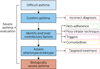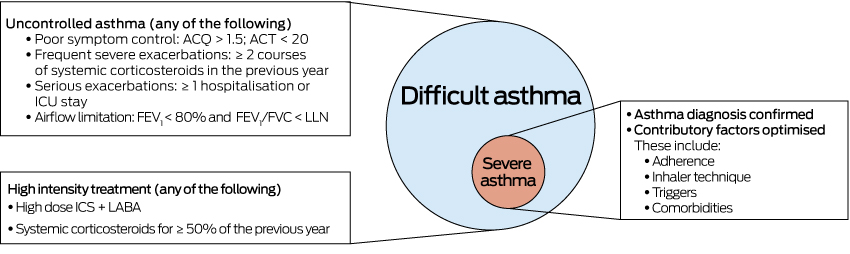 Patients are considered to have difficult-to-treat (difficult) asthma if their asthma remains uncontrolled despite high intensity asthma therapy (ie, high dose inhaled corticosteroids plus second controller), or if high intensity therapy is required to achieve control (Box 1).1 These patients comprise a heterogeneous group, in whom intrinsically severe asthma biology, incorrect diagnoses, patient behaviour and other contributory factors may all lead to poor asthma control.