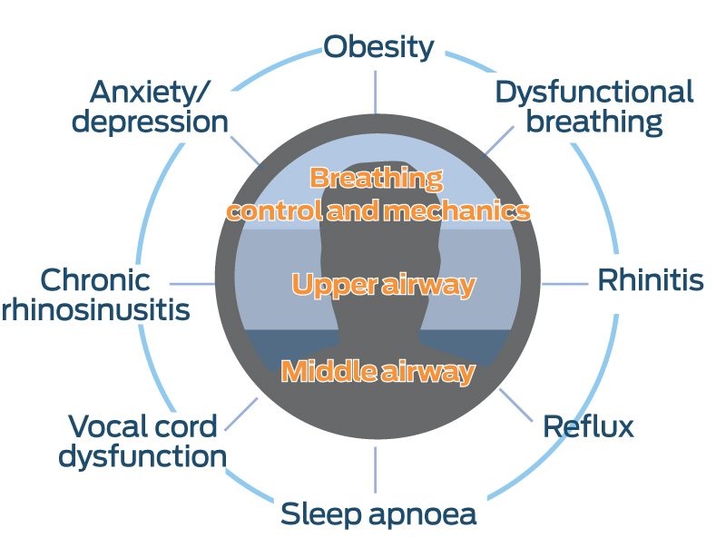 In addition, patients with more complex comorbidities who have already been evaluated by specialists may also benefit from a primary care management plan and a multidisciplinary team care arrangement. This enables the patient to access government-subsidised allied health interventions. This is particularly important for patients who live in regional areas who may not have regular or convenient access to allied health professionals in tertiary centres. These include a referral to a dietitian for patients who are obese, psychology support for patients with mental health disorders, a speech therapist for patients diagnosed with vocal cord dysfunction, and a respiratory physiotherapist for patients diagnosed with dysfunctional breathing.