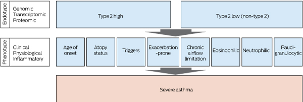 Clinical phenotypes highlight the heterogeneity of severe asthma but do not necessarily reflect the underlying disease process. With greater understanding of asthma immunology and the advent of -omics biology (genomics, transcriptomics, proteomics), researchers are now starting to discover various asthma endotypes. Endotypes refer to disease subgroups with distinct underlying biological mechanisms. Deconstructing asthma into aetiological and pathophysiological mechanisms assists in identifying targets for treatment119 (Box 8).