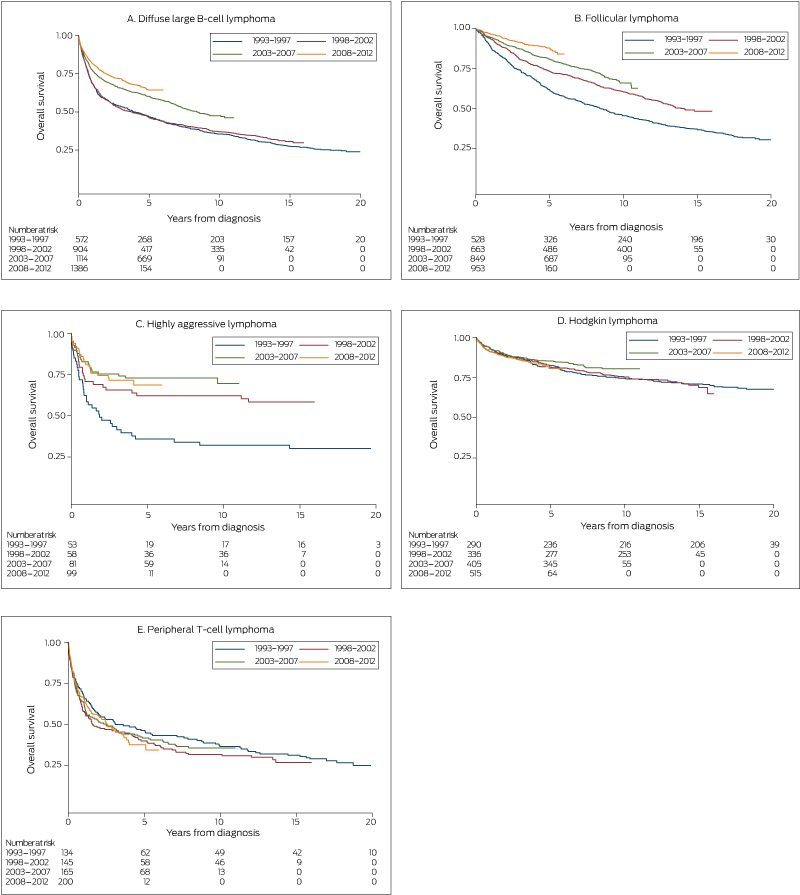 Results: 9509 people (56% men) were diagnosed with lymphoma during 1993–2012. Five-year relative survival improved significantly between 1993–1997 and 2008–2012 for patients with diffuse large B-cell lymphoma (47%; 95% CI, 42–51% v 64%; 95% CI, 61–67%) or follicular lymphoma (62%; 95% CI, 57–66% v 88%; 95% CI, 85–90%; each P < 0.001). Rituximab became available for treating these subtypes during 2003–2006. There was no change in relative survival for patients with Hodgkin lymphoma (81%; 95% CI, 76–85% v 80%; 95% CI, 75–84%; P = 0.22). The only statistically significant difference according to place of residence or socio-economic status was inferior relative survival for rural residents with diffuse large B-cell lymphoma (hazard ratio, 1.14; 95% CI, 1.01–1.28).