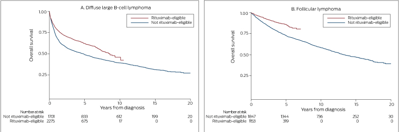 “Rituximab era” was defined according to when the drug was first listed by the Pharmaceutical Benefits Scheme for first-line therapy. For diffuse large B-cell lymphoma (DLBCL), this was from July 2003 for patients aged 60 years or more and from April 2005 for patients under 60; for patients with untreated advanced stage follicular lymphoma, it was December 2006.