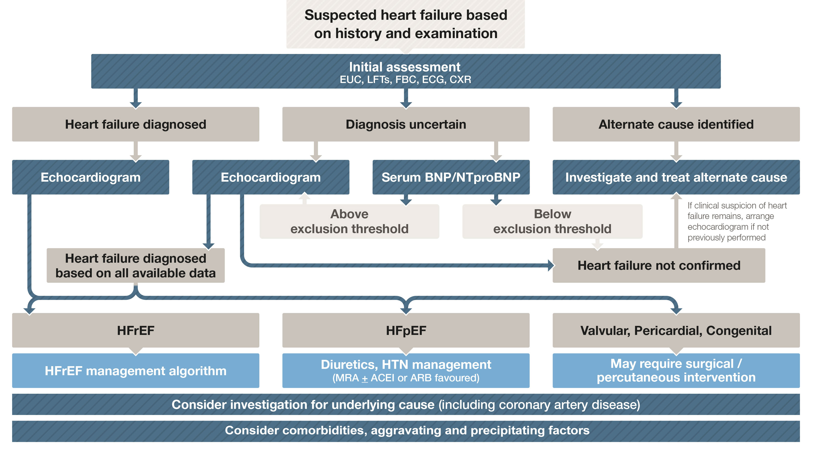 ACEI = angiotensin-converting enzyme inhibitor; ARB = angiotensin receptor blocker; BNP = B-type natriuretic peptide; CXR = chest x-ray; ECG = electrocardiogram; EUC = electrolytes/urea/creatinine; FBC = full blood count; HFpEF = heart failure with preserved ejection fraction; HFrEF = heart failure with reduced ejection fraction; HTN = hypertension; LFTs = liver function tests; MRA = mineralocorticoid receptor antagonist; NTproBNP = N-terminal pro B-type natriuretic peptide. Adapted with permission from Tomlinson S, Atherton JJ. Heart failure – the crucial role of the GP. Medicine Today 2018; 19: 19-27.